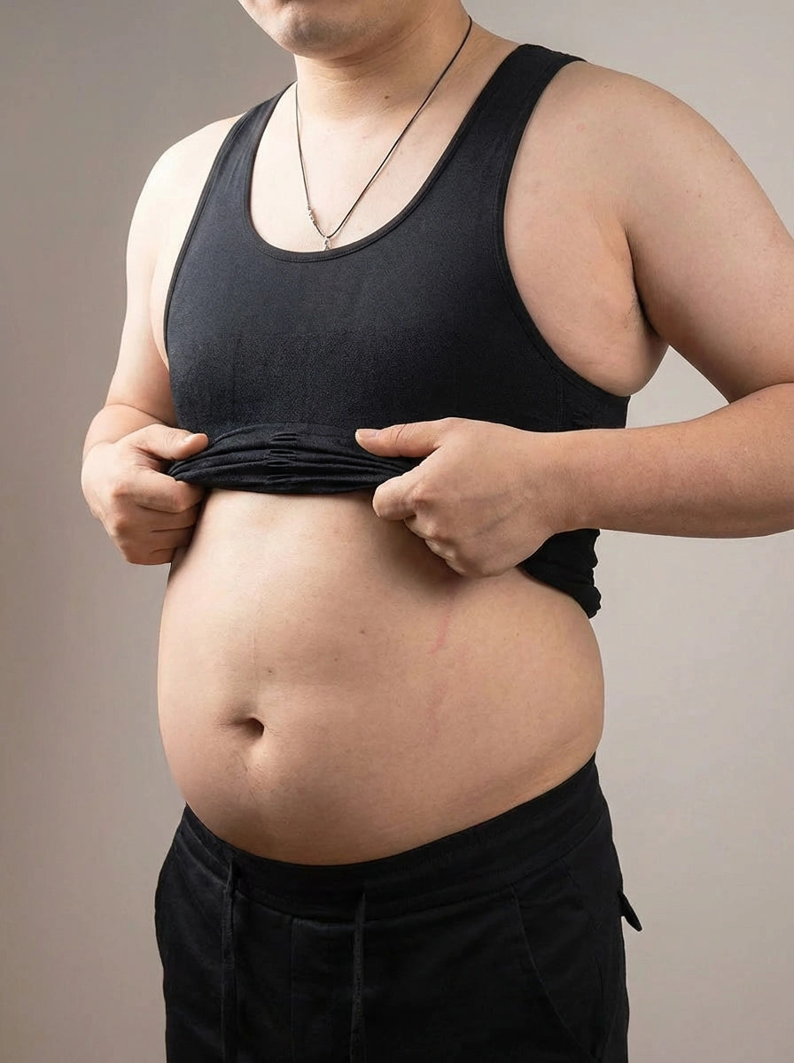 The stomach and love handles are clearly visible, making the torso look wider and less defined overall.
